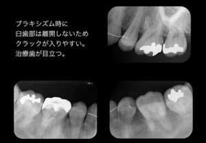 抜歯したスペースを埋めるために犬歯が内側に入りすぎて、下顎の左右の動きを制限してしまっていたと思われる。