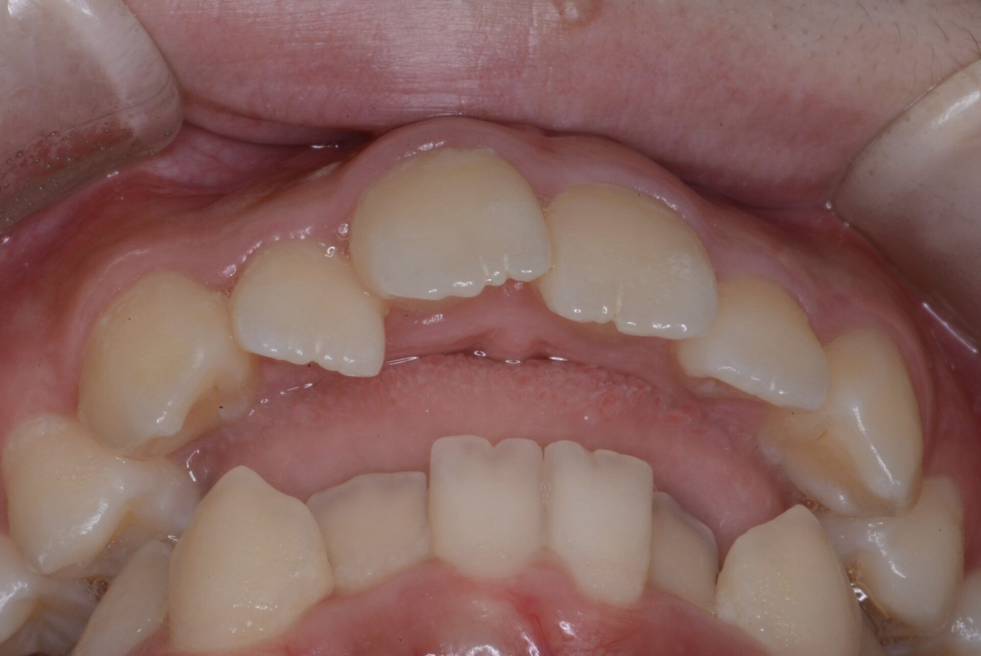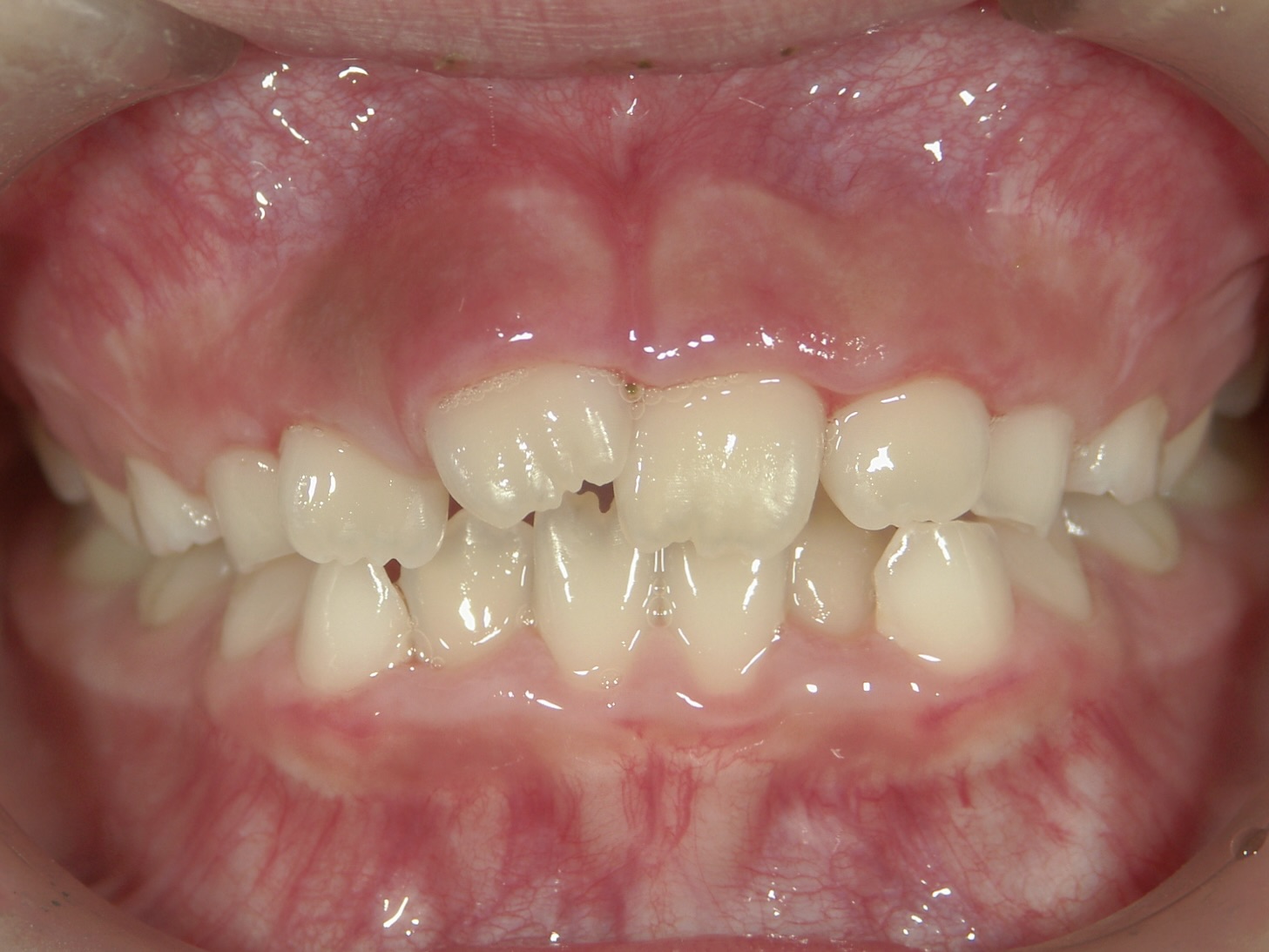 前歯が重なって生えてきている。この時点で歯が並ぶスペースが少ないことは十分予想できる。