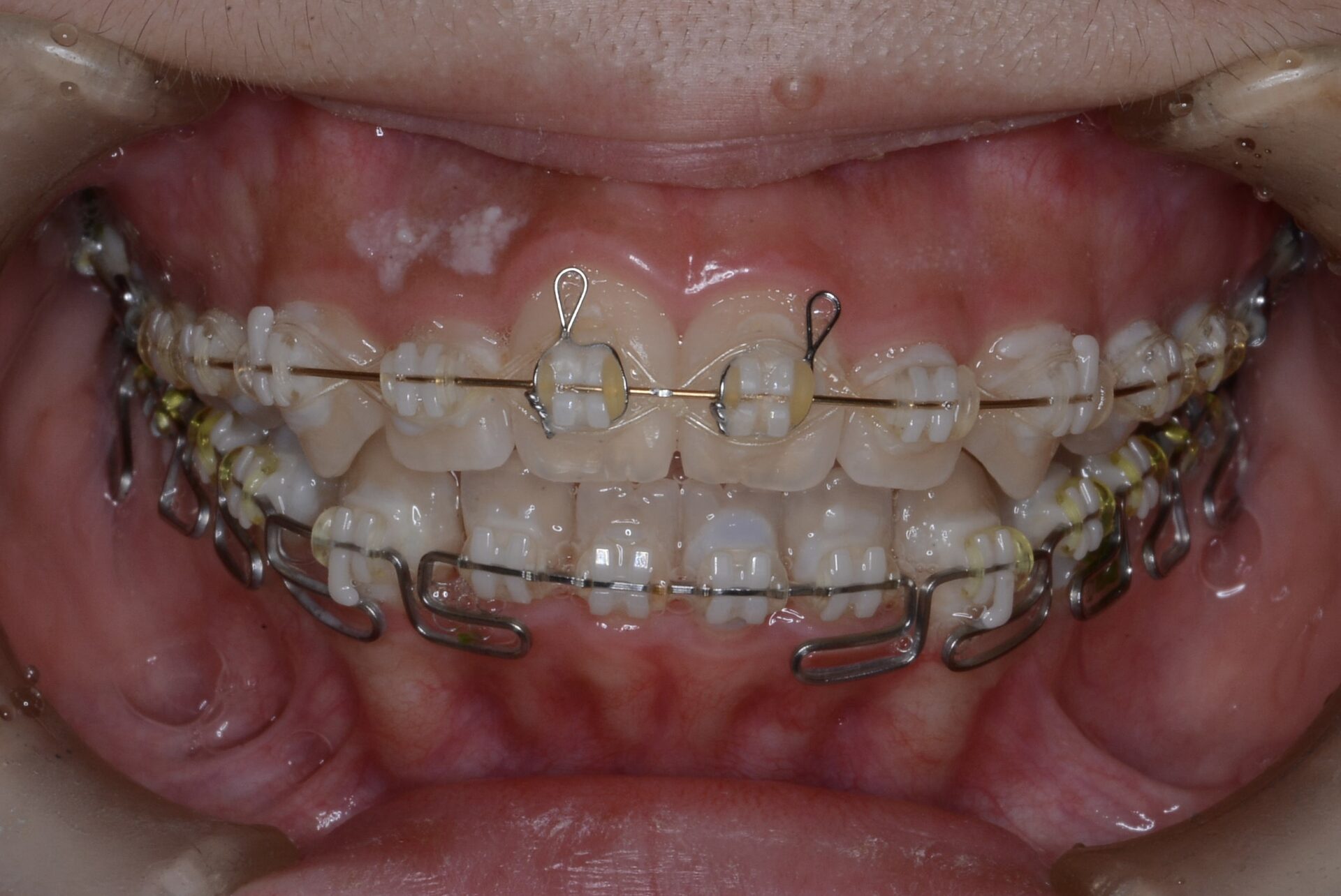下顎臼歯部の圧下をするためのワイヤーをセットするもなかなか前歯は噛んでこない。