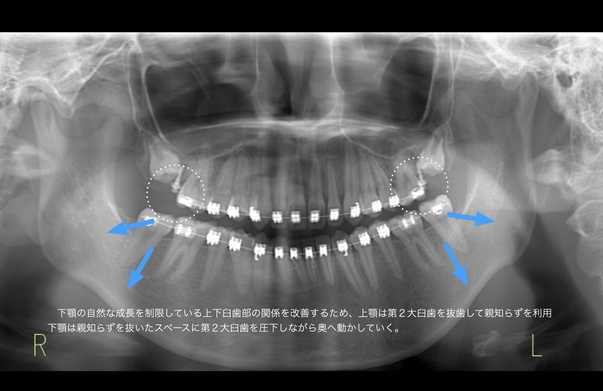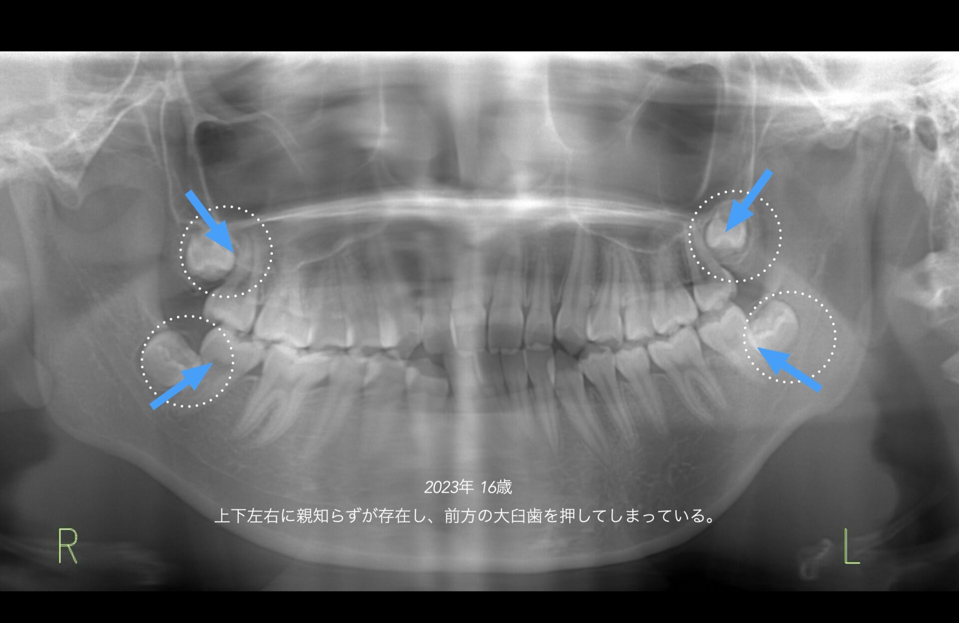 親知らずが上下左右存在する。下顎の前下方への成長を妨げている原因の一つと診断。下顎の親知らずを抜歯してから矯正をスタートする。