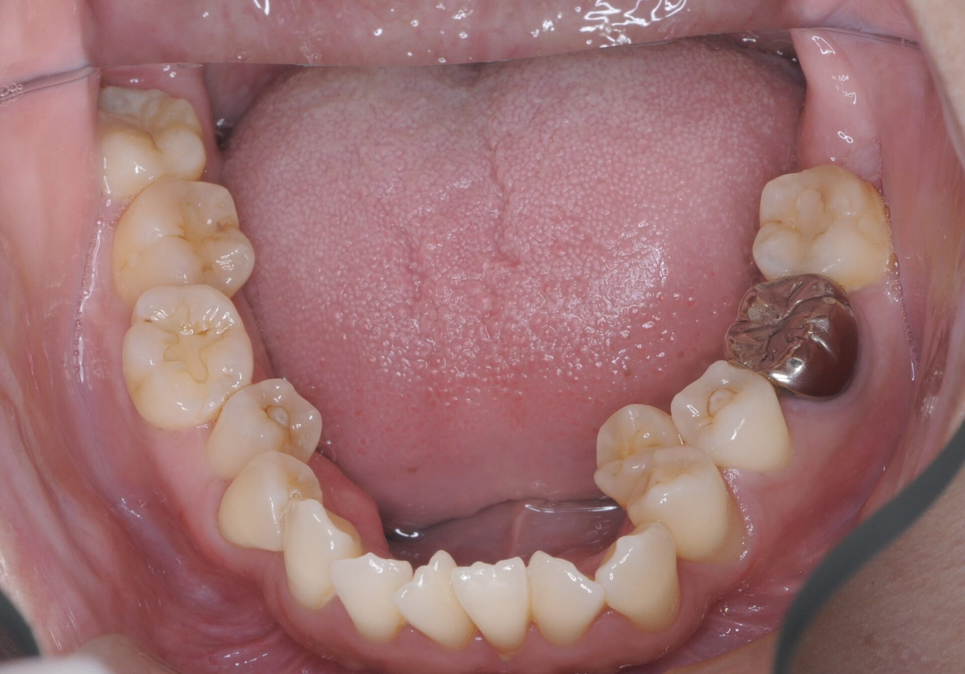 ジルコニア冠 ¥165.000治療期間 32ヶ月 来院回数 1回/月 メリット 奥歯だけで噛んでいたため負担が強く、奥歯の治療を繰り返している。矯正治療により全体で咬合を負担できる。 リスク すでに神経のない歯もあり、夜間のナイトガードは必須。埋伏している右下の過剰歯を利用するため矯正期間は長期となる。 -